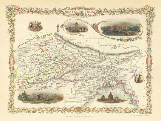 Die Karte enthält zahlreiche Städte und Orte wie Delhi, Kalkutta, Lucknow, Agra und Kathmandu, von denen jeder seine eigene historische und kulturelle Bedeutung hat. Diese Siedlungen sind sorgfältig beschriftet und bieten einen Schnappschuss der Stadtlandschaft während der britischen Herrschaft. Der dekorative Rand und die künstlerischen Gravuren der Karte machen sie nicht nur zu einem wertvollen historischen Dokument, sondern auch zu einem wunderschönen Kunstwerk. Sammler und Liebhaber werden die Fähigkeit der Karte zu schätzen wissen, sie in die Zeit zurückzuversetzen und ein Fenster in die komplexe und faszinierende Geschichte Nordindiens zu öffnen.