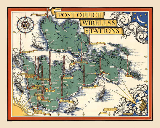 Diese Karte illustriert die Britischen Inseln und all ihre drahtlosen Stationen, die bis zur Mitte des 20. Jahrhunderts im Besitz und Betrieb des General Post Office (GPO) waren.