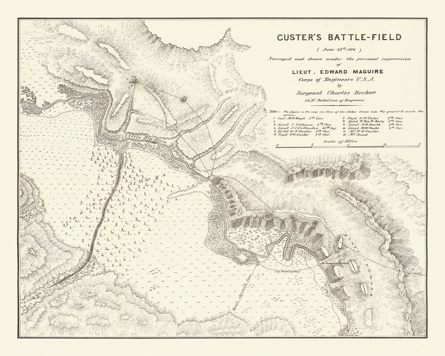 Custers Schlachtfeld (25. Juni 1876), erstellt vom U.S. Army Corps of Engineers unter der direkten Aufsicht von Lieutenant Edward Maguire, gilt als eine der autoritativsten historischen Karten, die die Momente der Schlacht am Little Bighorn festhält, die auch berüchtigt als Custers letzte Schlacht bekannt ist. Produziert im Jahr 1876 kurz nach dem schicksalhaften Zusammenstoß, bietet dieser Kupferstich außergewöhnliche Details über den Ort der Niederlage von Lt. Col. George Armstrong Custer in der Nähe der Mündung des Bighorn River im Südosten Montanas. Die Karte wurde sorgfältig vermessen, während Maguire Rettungstruppen zum Schlachtfeld begleitete, und schuf ein kartografisches Dokument, das nicht nur als Navigationswerkzeug dient, sondern auch als Zeugnis eines entscheidenden Ereignisses im amerikanischen Westen.