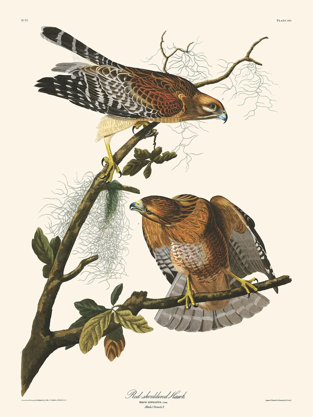John James Audubon war ein Pionier der amerikanischen Tierkunst und wurde für seinen Ehrgeiz gefeiert, alle Arten nordamerikanischer Vogelarten zu dokumentieren und zu illustrieren. Sein Werk Birds of America, das 435 lebensgroße Drucke umfasst, ist aufgrund seiner Breite und Präzision zu einem wichtigen Nachschlagewerk in der Ornithologie und Kunstgeschichte geworden. Die Illustration des Rotschulterbussards zeigt sowohl sein künstlerisches Können als auch seine Hingabe zur Naturgeschichte.