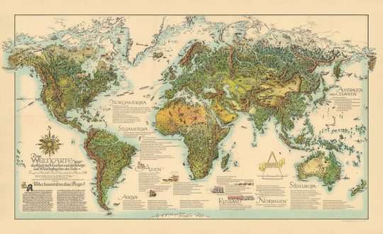 Betreten Sie die lebendige Welt der Nachkriegs-Kartografie mit Otto Wommelsdorffs „Diese Weltkarte zeigt die Arbeit des Menschen und die Schätze und Wirtschaftsgüter der Erde“, einer meisterhaften bildlichen Karte aus etwa 1950. Diese Karte, die im Gefolge des Zweiten Weltkriegs entstand, ist ein Zeugnis für den erneuten Fokus der Ära auf die globale wirtschaftliche Erholung und die Vernetzung. Wommelsdorffs Vision wird durch kunstvolle Illustrationen zum Leben erweckt, die die „Arbeit des Menschen“ und die reichhaltigen „Schätze und Wirtschaftsgüter der Erde“ feiern und einen faszinierenden Einblick in die Hoffnungen und Prioritäten einer sich selbst wiederaufbauenden Welt bieten.
