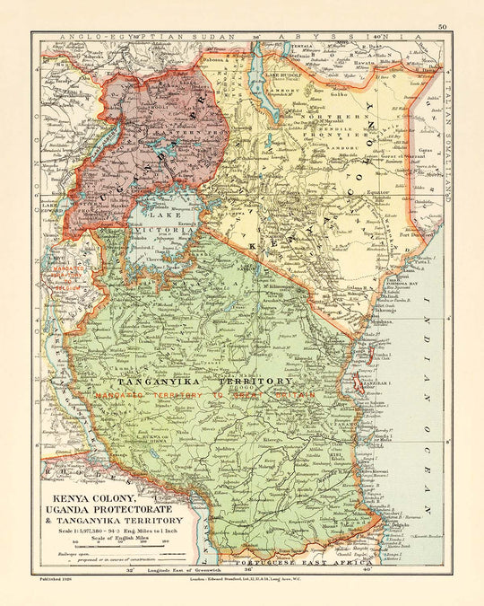 Betreten Sie die fesselnde Welt der Kartografie des frühen 20. Jahrhunderts mit "Kenya Colony, Uganda Protectorate & Tanganyika Territory," einer Karte, die sowohl ein Zeugnis kolonialer Ambitionen als auch ein Meisterwerk geografischer Darstellung ist. 1926 von der angesehenen Edward Stanford Ltd. erstellt, wurde diese Karte zu einer Zeit veröffentlicht, als das Britische Empire seine ostafrikanischen Gebiete akribisch kartierte. Der ursprüngliche Titel selbst ruft den Geist der Erkundung und Verwaltung der Ära hervor und bietet einen Einblick in eine Landschaft am Rande der Transformation. Die sorgfältige Abgrenzung politischer Grenzen und Infrastrukturen dieser Karte offenbart nicht nur das Ausmaß des britischen Einflusses, sondern auch die Komplexität und Vielfalt der Regionen, die zu dem modernen Kenia, Uganda, Ruanda und Tansania werden sollten.