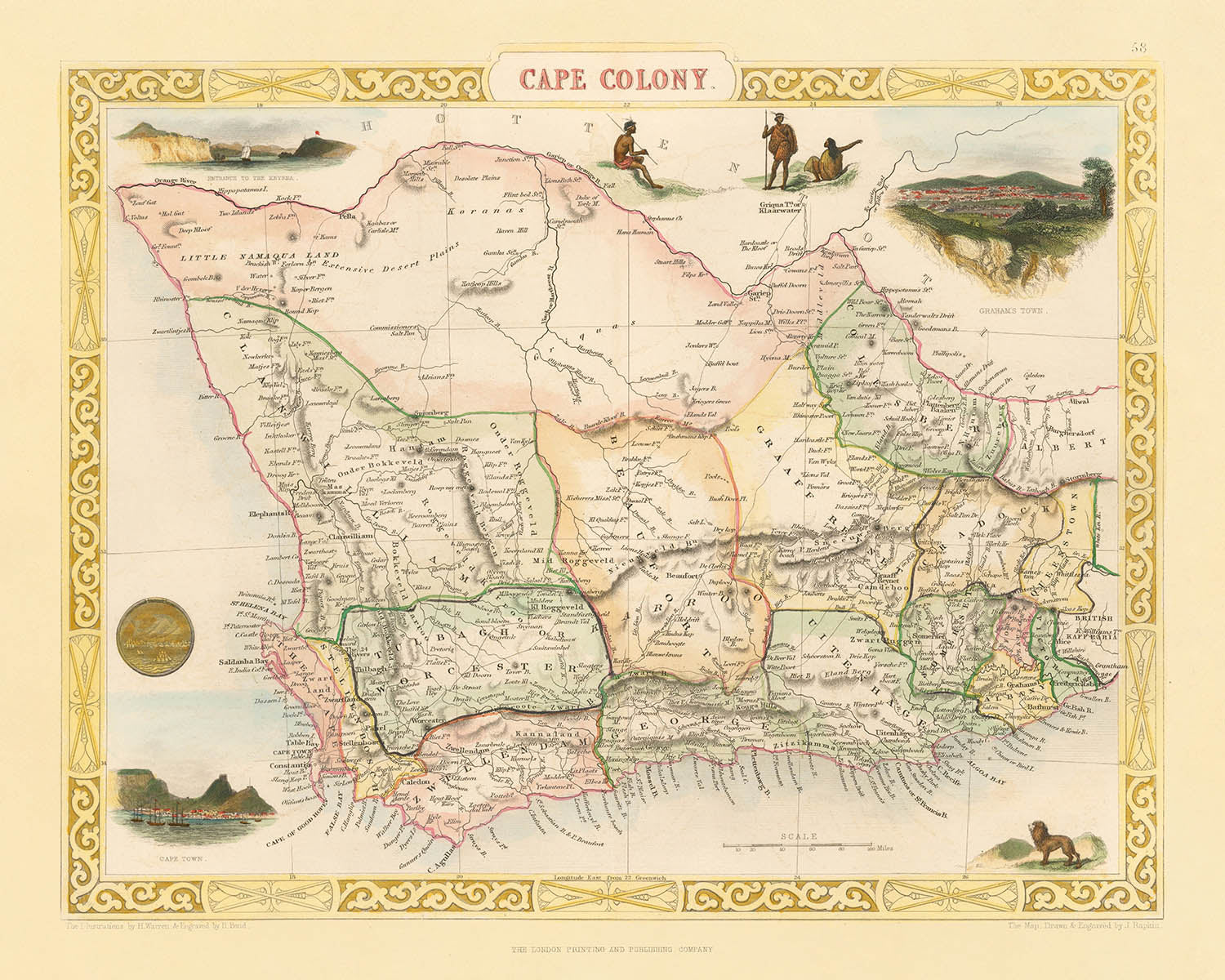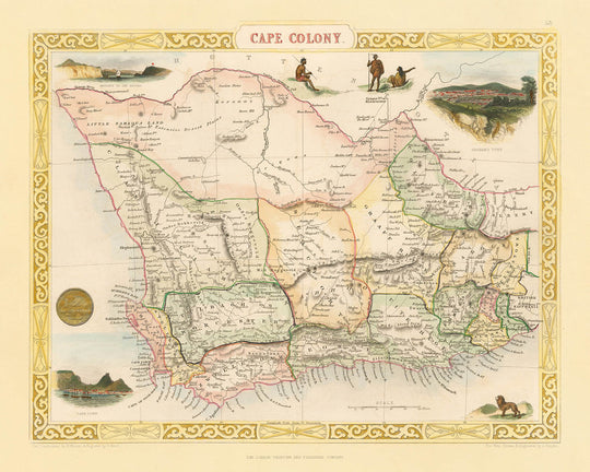 John Tallis, gefeiert als einer der letzten großen dekorativen Kartenmacher, verlieh seinen Kreationen sowohl wissenschaftliche Präzision als auch künstlerischen Schwung. Seine Karten sind für ihre eleganten Ränder und eindrucksvollen Vignetten geschätzt, und „Kapkolonie“ ist da keine Ausnahme. Hier strahlt Tallis’ Kunstfertigkeit in den wunderschön gestalteten Illustrationen von Kapstadt, Grahamstown und dem Eingang zur Knysna durch—jede Szene ein Blick in die Landschaften und Siedlungen, die die Region prägten. Diese Vignetten, sorgfältig graviert und handkoloriert, verwandeln die Karte in eine visuelle Reise durch die geschichtsträchtige Vergangenheit des Kaps.