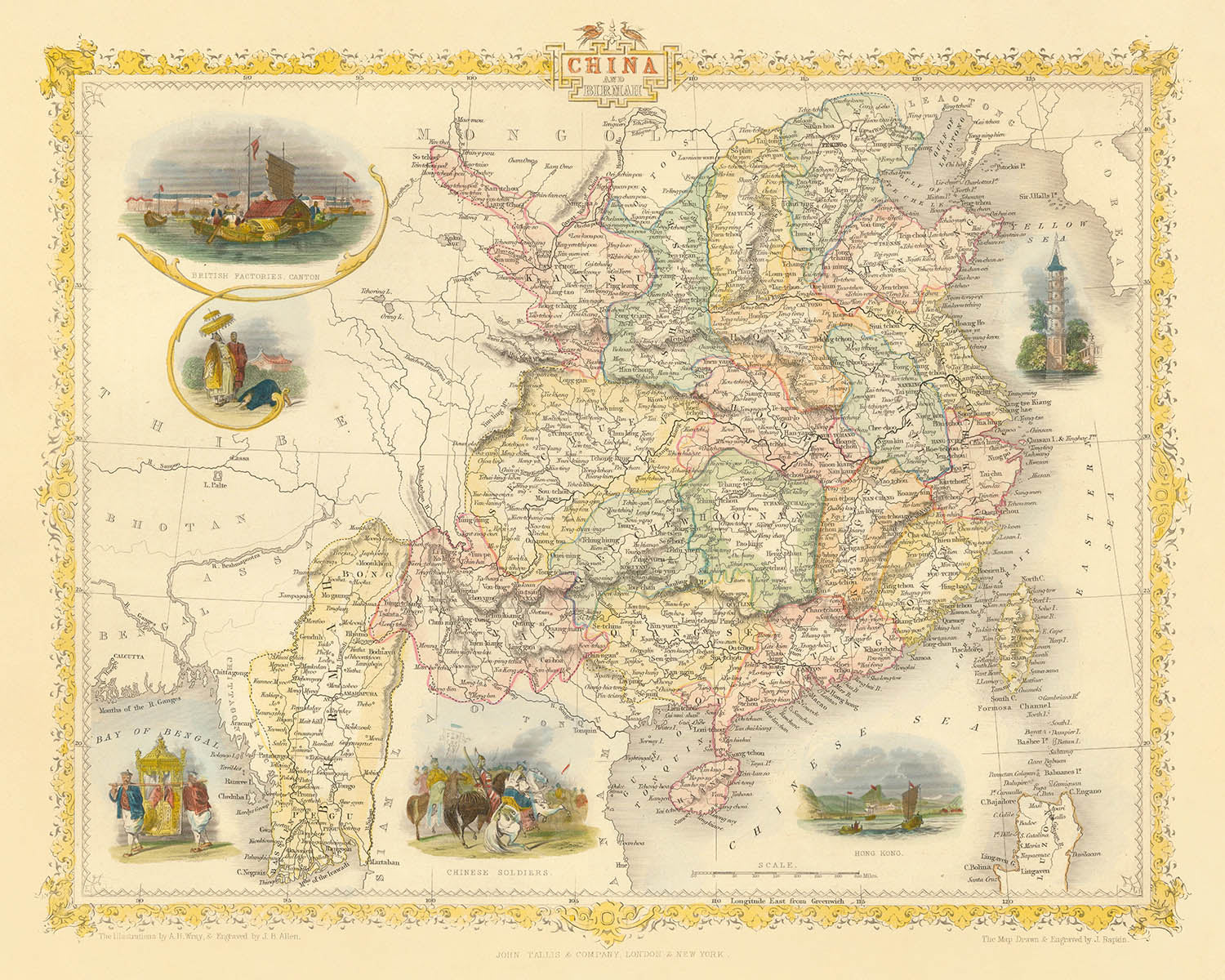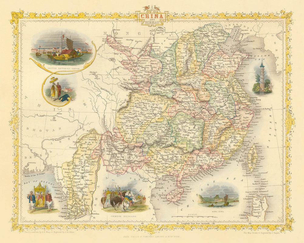 John Tallis, gefeiert als einer der letzten großen dekorativen Kartenmacher, verlieh seinen Werken eine charakteristische Mischung aus Präzision und Kunstfertigkeit. Seine Karten sind bekannt für ihre komplizierten Ränder und eindringlichen Vignetten, und dieses Stück bildet da keine Ausnahme. Hier erweckt Tallis' Hand nicht nur die politischen Grenzen und Provinzen Chinas und Burmas zum Leben, sondern auch das dynamische Zusammenspiel von kolonialer Ambition und einheimischer Tradition. Die dekorativen Vignetten der Karte - wie die geschäftigen britischen Fabriken in Kanton und die panoramische Vogelperspektive von Hongkong - spiegeln den aufblühenden Handel und den kulturellen Austausch zwischen Ost und West wider und bieten einen Einblick in das tägliche Leben und die militärische Präsenz der Region.