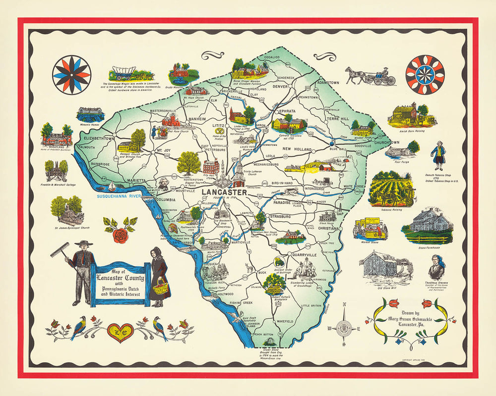 Die „Karte des Lancaster County mit Pennsylvania Dutch und historischem Interesse“, die 1949 von Mary Susan Schmuckle erstellt wurde, ist eine fesselnde bildliche und thematische Stadtkarte, die die Betrachter in das reiche kulturelle Gefüge des Lancaster County, Pennsylvania, eintauchen lässt. Schmuckles Kunstfertigkeit und Liebe zum Detail erwecken das einzigartige Pennsylvania Dutch Erbe zum Leben, mit handgezeichneten Illustrationen, die die historischen Wahrzeichen, landwirtschaftlichen Wurzeln und lebendigen Gemeinschaften der Region feiern. Diese Karte ist mehr als ein Navigationswerkzeug – sie ist ein visuelles Geschichtsbuch, das den Geist des Lancaster County in einem entscheidenden Moment seiner Geschichte einfängt, kurz nach dem Zweiten Weltkrieg.