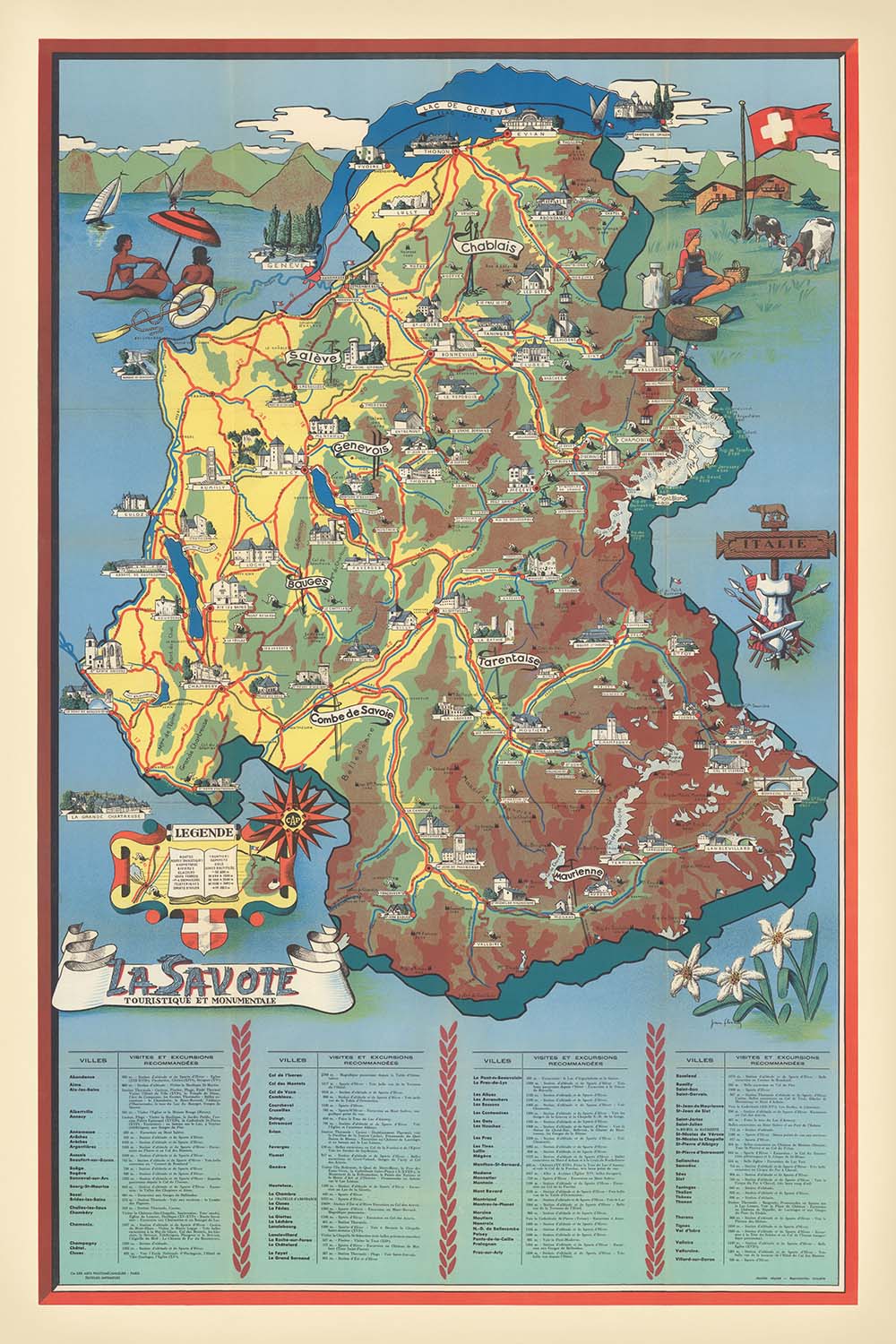 Betreten Sie das bezaubernde Herz der französischen Alpen mit "La Savoie Touristique et Monumentale", einer exquisiten bildlichen Karte, die 1950 vom angesehenen Jean Flornoy erstellt wurde. Dieses Meisterwerk bietet ein lebendiges Fenster in die Region Savoie, die für ihre majestätischen Gipfel, kristallklaren Seen und ihre geschichtsträchtige Architektur bekannt ist. Der ursprüngliche französische Titel selbst evoziert ein doppeltes Gefühl von Abenteuer und Ehrfurcht und lädt den Betrachter ein, sowohl die touristischen Wunder als auch die monumentalen Wahrzeichen zu erkunden, die diese historische Provinz prägen. Flornoys Kunstfertigkeit und Liebe zum Detail verwandeln die Karte in mehr als nur ein Navigationswerkzeug – sie wird zu einer visuellen Ode an die kulturelle und natürliche Pracht der Savoie.