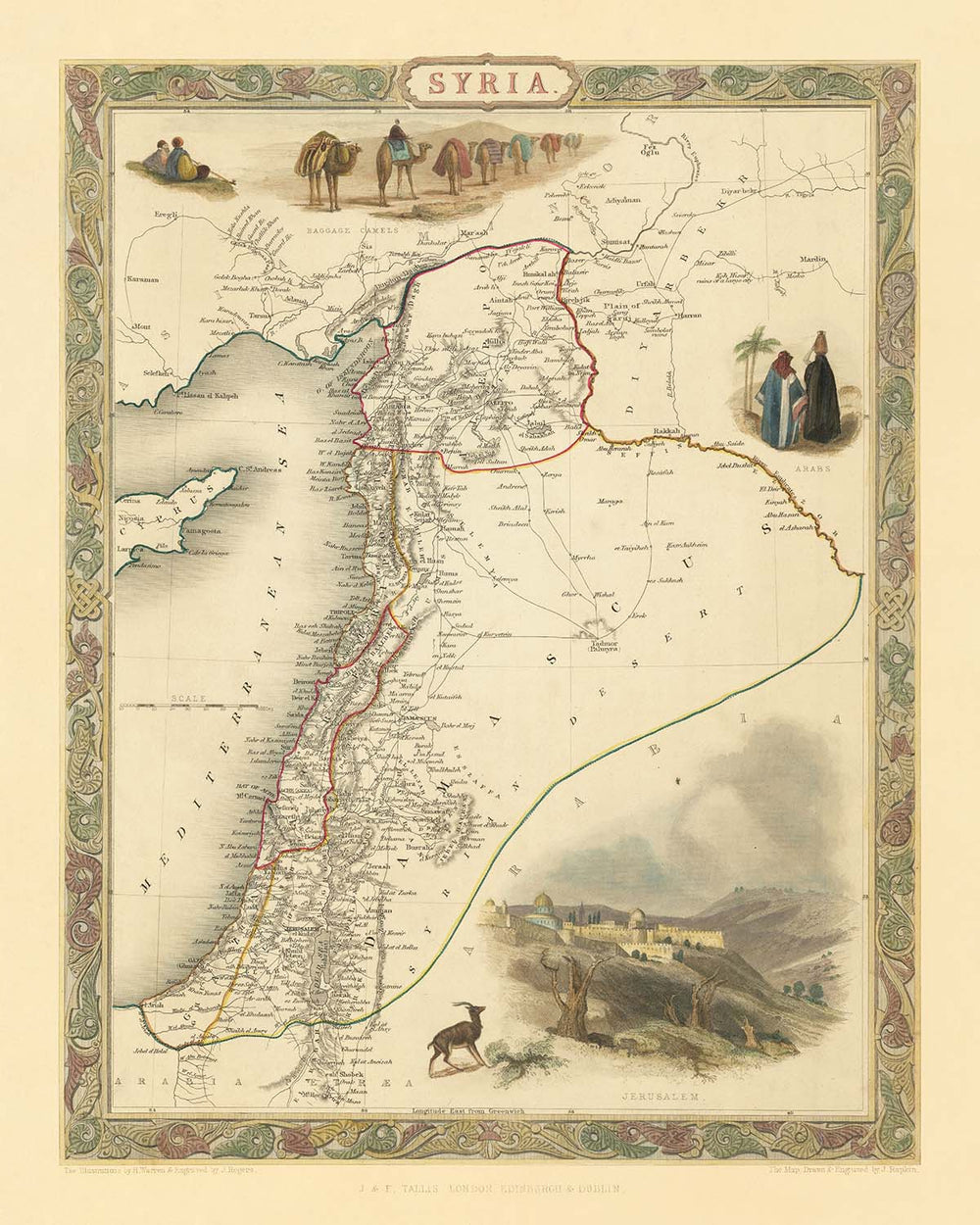 Der visuelle Reichtum der Karte wird durch Tallis' charakteristische dekorative Vignetten weiter verstärkt, die die kartografischen Details mit eindrucksvollen Szenen aus Jerusalem, lokalen Bewohnern in traditioneller Kleidung und Karawanen von Lastkamelen, die die trockene Landschaft durchqueren, umrahmen. Diese Illustrationen fügen nicht nur ästhetischen Wert hinzu, sondern dienen auch als kulturelle Linse, die Einblicke in die täglichen Rhythmen und die beständigen Traditionen der Menschen bietet, die das Land prägten. Die physische Geografie wird mit gleicher Sorgfalt dargestellt und hebt die imposanten Gebirgszüge des Libanon und Anti-Libanon, das schimmernde Tote Meer und die üppigen Täler hervor, die Zivilisationen seit Jahrtausenden ernährt haben.