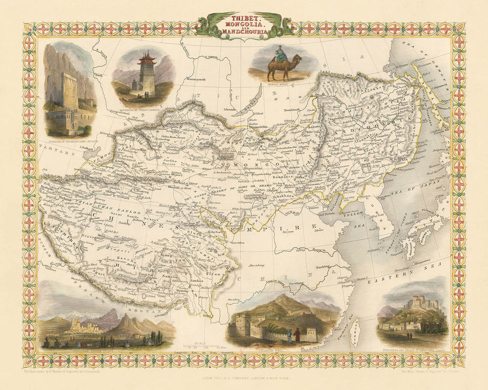 John Tallis, bekannt als einer der letzten großen dekorativen Kartografen, verlieh seinen Werken ein Gefühl von Wunder und Entdeckung. Seine Karten zeichnen sich nicht nur durch ihre geografische Präzision aus, sondern auch durch ihre kunstvollen Verzierungen – hier umgeben eine Reihe exquisiter Vignetten die Karte, die jeweils den Geist und die Pracht der dargestellten Länder einfangen. Vom majestätischen Wohnsitz des Tessaling Lama bis zur imposanten Festung und dem Palast des Dalai Lama wecken diese Illustrationen das Geheimnis und den Reiz, die viktorianische Zuschauer so faszinierten.