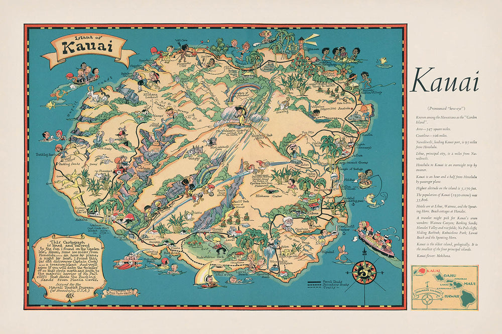 Betreten Sie die üppige, geschichtsträchtige Welt von Hawaiis Garteninsel mit der 1935 veröffentlichten bildlichen Karte mit dem schlichten Titel „Kauai“, einer faszinierenden Kreation des renommierten Hawaii Tourist Bureau. Diese Karte ist mehr als ein Navigationswerkzeug – sie ist ein lebendiges Fenster in die Vergangenheit, das sowohl die natürliche Pracht der Insel als auch den Geist von Erkundung und Freizeit zu Beginn des 20. Jahrhunderts widerspiegelt. In einer entscheidenden Ära, als Hawaii sich als erstklassiges Reiseziel etablierte, signalisiert der ursprüngliche Titel der Karte ihre Absicht: Besucher mit den Wundern von Kauai zu verlocken und zu informieren, während sie gleichzeitig die einzigartige Identität der Hawaiianischen Inseln feiert.