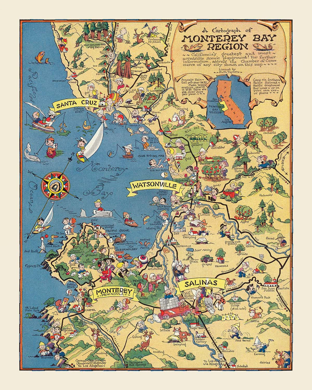 Über den landwirtschaftlichen Fokus hinaus ist die Karte eine Feier des reichen Gewebes von Gemeinschaften und Landschaften in der Monterey-Bucht-Region. Wichtige Städte wie Santa Cruz, Monterey, Salinas und Carmel werden mit liebevollen Details dargestellt, während die Santa Cruz Mountains, der Salinas River und die dramatische Pazifikküste eine atemberaubende natürliche Kulisse bieten. Der bildliche Stil der Karte bietet nicht nur geografische Orientierung, sondern auch ein Gefühl für das lebendige tägliche Leben und die Freizeitbeschäftigungen, die das Gebiet zu einem Magneten für Besucher und Siedler machten.