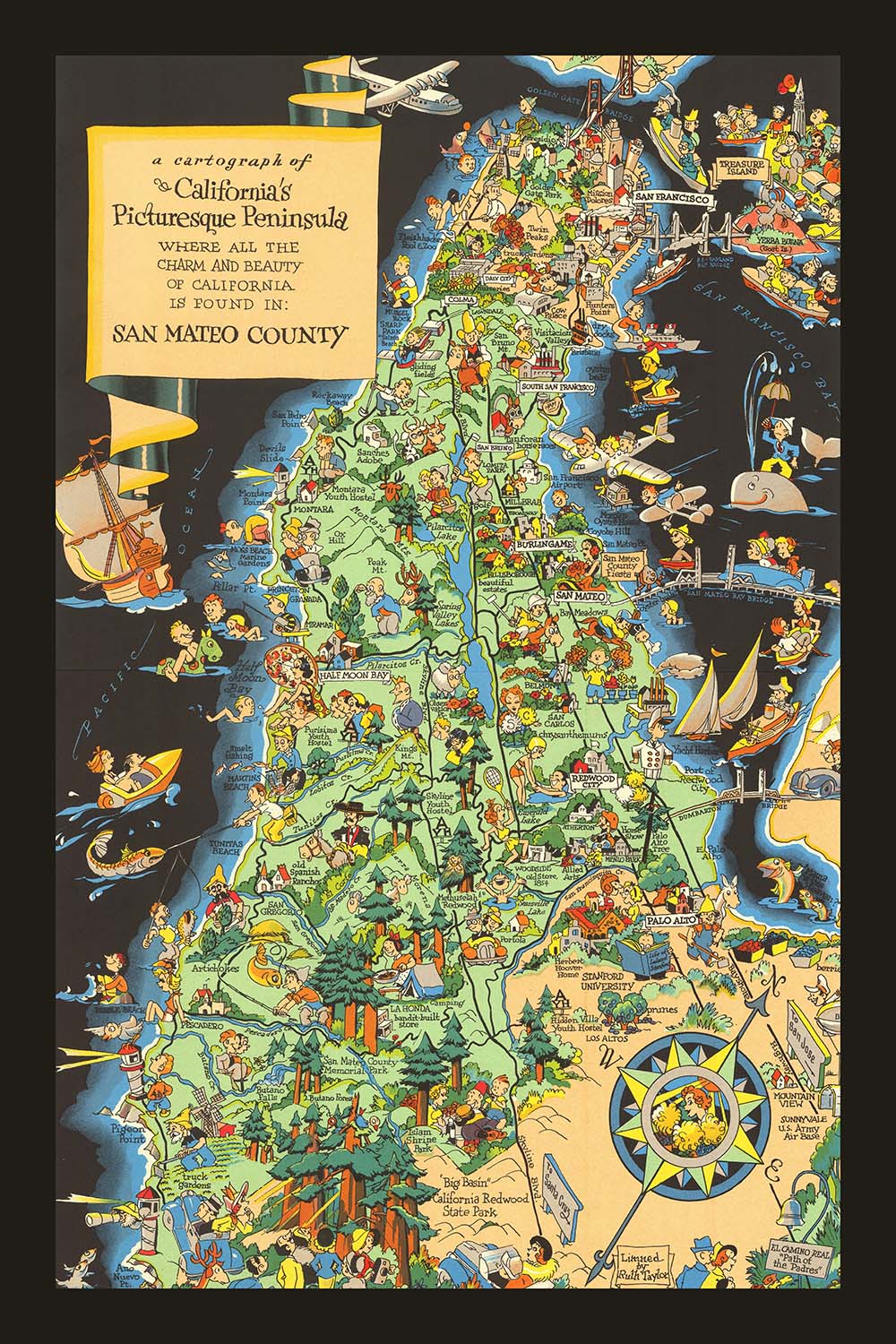 Bildkarte des San Mateo County, Kalifornien von Ruth Taylor White, 1930: Southern Pacific Railroad, Crystal Springs Reservoir, Dumbarton Bridge, Redwood City, Half Moon Bay