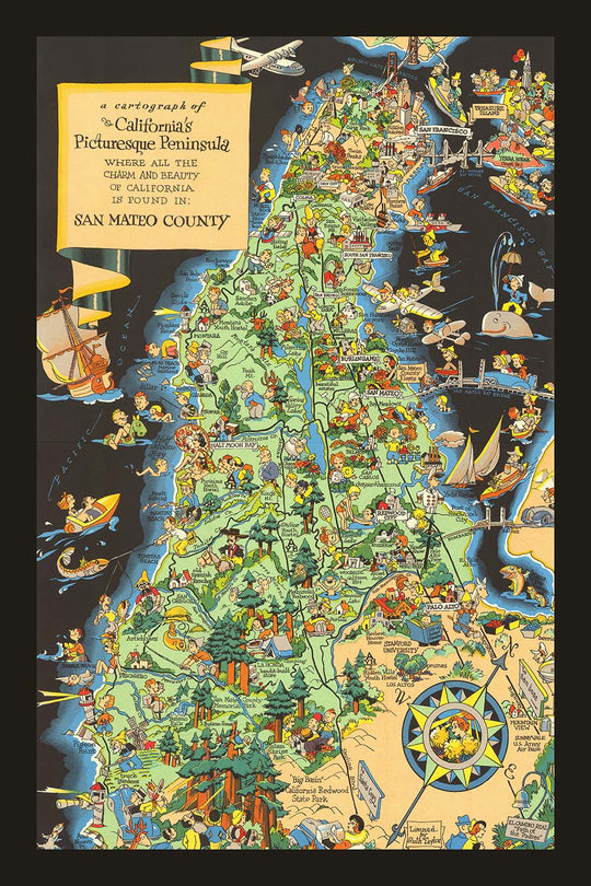 Was diese Karte wirklich auszeichnet, ist ihre Fähigkeit, die Vergangenheit und die Gegenwart des Landkreises miteinander zu verweben und sowohl seine geschichtsträchtige Vergangenheit als auch sein lebendiges zeitgenössisches Leben zu präsentieren. Die verspielten Szenen von Golf, Reiten und Strandbesuchen spiegeln die Freizeitbeschäftigungen wider, die die Ära prägten, während die Einbeziehung lokaler Industrien – wie Blumen- und Artischockenanbau – auf das landwirtschaftliche Erbe des Landkreises hinweist. Karikaturen von Bewohnern und Besuchern, die alltäglichen Aktivitäten nachgehen, verleihen der Karte ein erfreuliches Gefühl von Persönlichkeit und Ort und machen sie zu einem lebhaften Zeugnis des Gemeinschaftsgeistes von San Mateo in den 1930er Jahren.