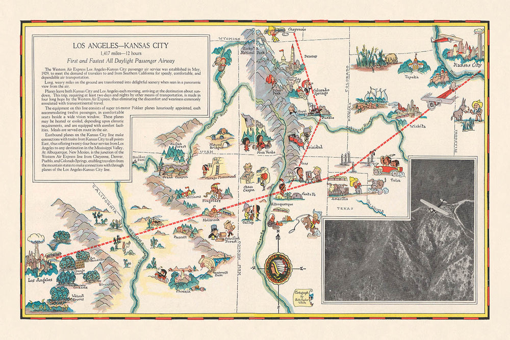Bildkarte der Luftstraße Los Angeles–Kansas City, 1929: Grand Canyon, Rocky Mountains, Western Air Express