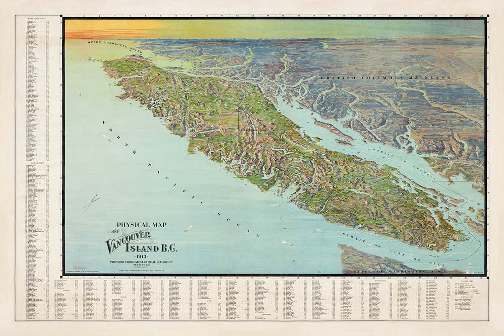 Der künstlerische Stil der Karte kombiniert sowohl Nützlichkeit als auch Eleganz, mit sorgfältig dargestellten topografischen Merkmalen wie Gebirgen, Flüssen, Seen und der dramatischen Küstenlinie der Insel. Wichtige Städte wie Victoria, Nanaimo und Alberni sind deutlich beschriftet, neben kleineren Siedlungen und Außenposten, was einen umfassenden Überblick über die menschliche Geographie von Vancouver Island im Jahr 1913 bietet. Die Aufnahme eines detaillierten Index in den Rändern erhöht den navigationalen Wert der Karte weiter und macht sie zu einer unverzichtbaren Ressource für Historiker und Sammler.