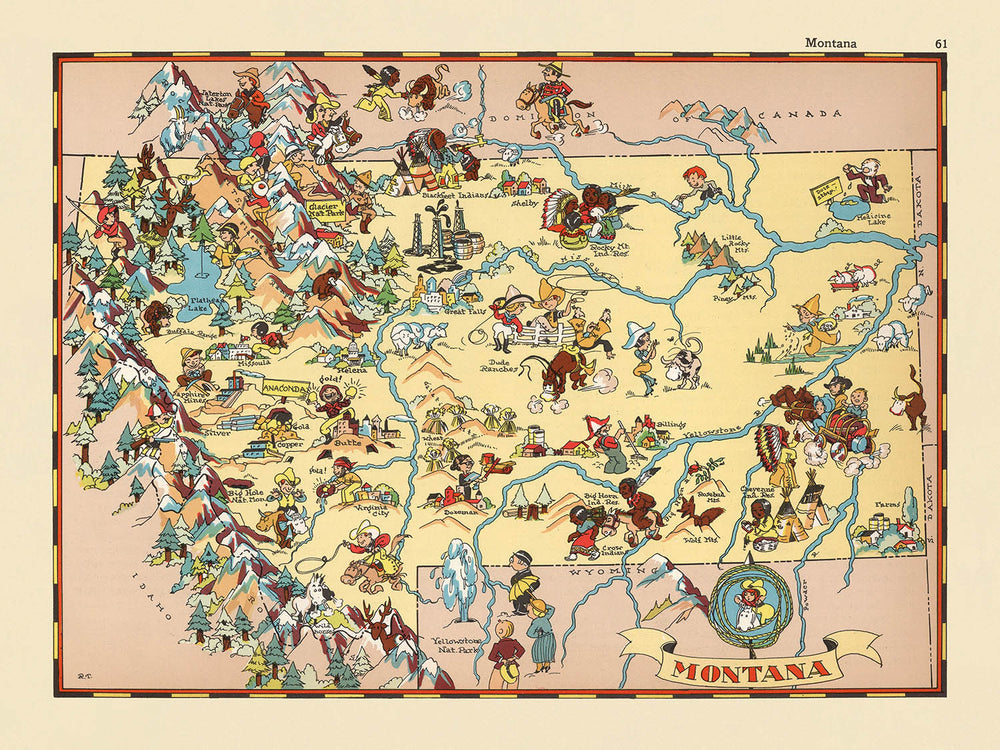 Bildkarte von Montana von Ruth Taylor White, 1935: Billings, Missoula, Yellowstone- und Glacier-Nationalparks, Rocky Mountains, Missouri River