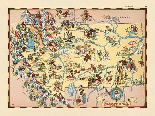 Über ihre geografische Genauigkeit hinaus dient „Montana“ als Fenster in das wirtschaftliche und soziale Leben des Bundesstaates zu Beginn des zwanzigsten Jahrhunderts. Die Illustrationen wimmeln von Anspielungen auf Viehzucht, Bergbau, Landwirtschaft und Holzindustrie – Industrien, die die Entwicklung und Identität Montanas prägten. Wildtiere wie Bären, Bisons und Rehe streifen frei über die Landschaft, während Szenen von Weizenfeldern und Bauernhöfen den landwirtschaftlichen Reichtum der Region heraufbeschwören. Die Great Plains werden mit weitläufigen Präriebildern dargestellt, die wunderschön mit den bewaldeten Bergregionen und Flusstälern kontrastieren.