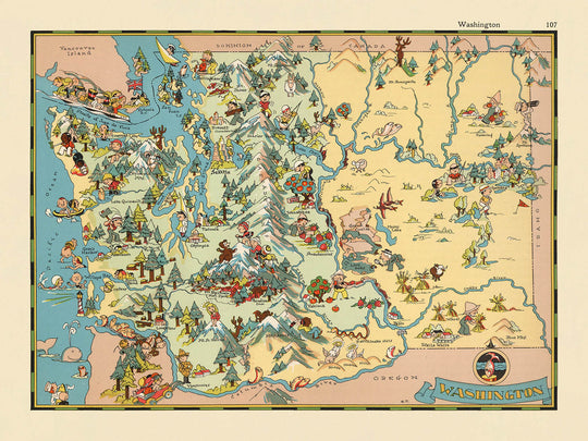 Die Kunstfertigkeit von Ruth Taylor White wird sofort in dem verspielten, cartoonhaften Stil der Karte offensichtlich, der die Geographie Washingtons in ein visuelles Fest verwandelt. Die Karte ist geschmückt mit lebhaften Darstellungen der ikonischsten natürlichen Merkmale des Staates: der schneebedeckten Majestät des Mount Rainier und des Mount St. Helens, der rauen Weite der Cascade- und Olympic Mountains sowie dem gewundenen Verlauf des mächtigen Columbia River. Entlang der pazifischen Küste wecken maritime Szenen und Schiffe die beständige Verbindung des Staates zum Meer, während das üppige, bewaldete Innere mit Bildern von Holzfällern und der florierenden Holzindustrie zum Leben erweckt wird.