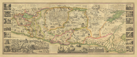 Was diese Karte besonders macht, ist ihre reich illustrierte Erzählung, die die bedeutendsten Ereignisse des Alten und Neuen Testaments zum Leben erweckt. Hunderte winziger Vignetten, jede sorgfältig graviert, zeigen Momente wie den Exodus, das Überqueren des Roten Meeres und Moses, der die Zehn Gebote auf dem Berg Sinai empfängt. Diese Szenen sind nicht nur Dekoration; sie sind historische Wegpunkte, die den Betrachter einladen, die Reisen, Kämpfe und Triumphe biblischer Figuren über das Terrain nachzuvollziehen. Der bildliche Ansatz der Karte verwandelt sie in ein einzigartiges Artefakt – sowohl ein Kunstwerk als auch ein didaktisches Werkzeug zum Verständnis der antiken Welt.