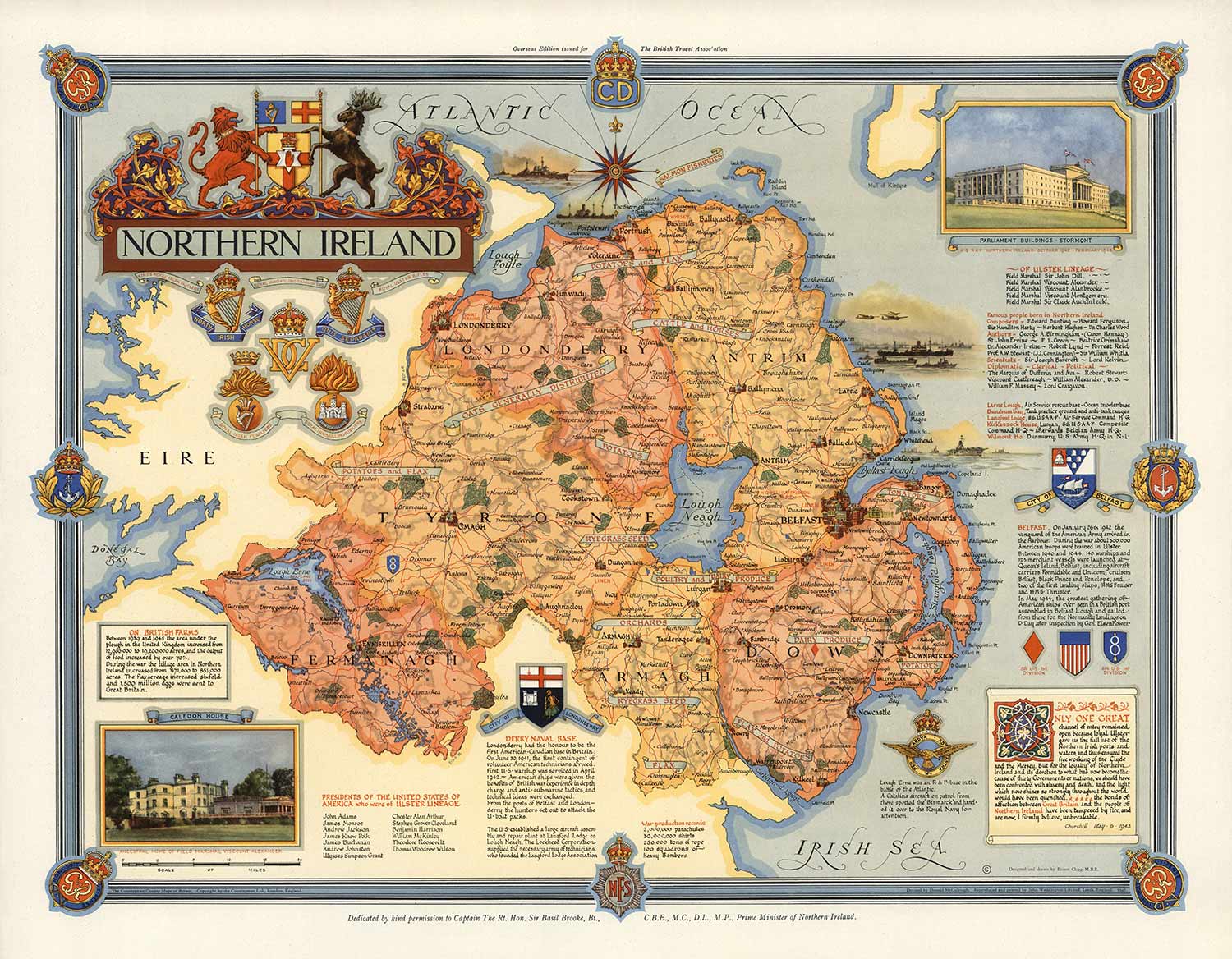 Dies ist eine ganz detaillierte Karte, die einen neuen Blick auf die Parlamentsgebäude in Stormont, dem Ahnenhaus des Feldmarschall Viscount Alexander, zeigt, und es gibt viele Anmerkungen auf der Karte. Zum Beispiel sieht es aus, als wollte County Armagh viel Ryegrass-Samen anbauen, und Antrim war gut für Rinder und Pferde.