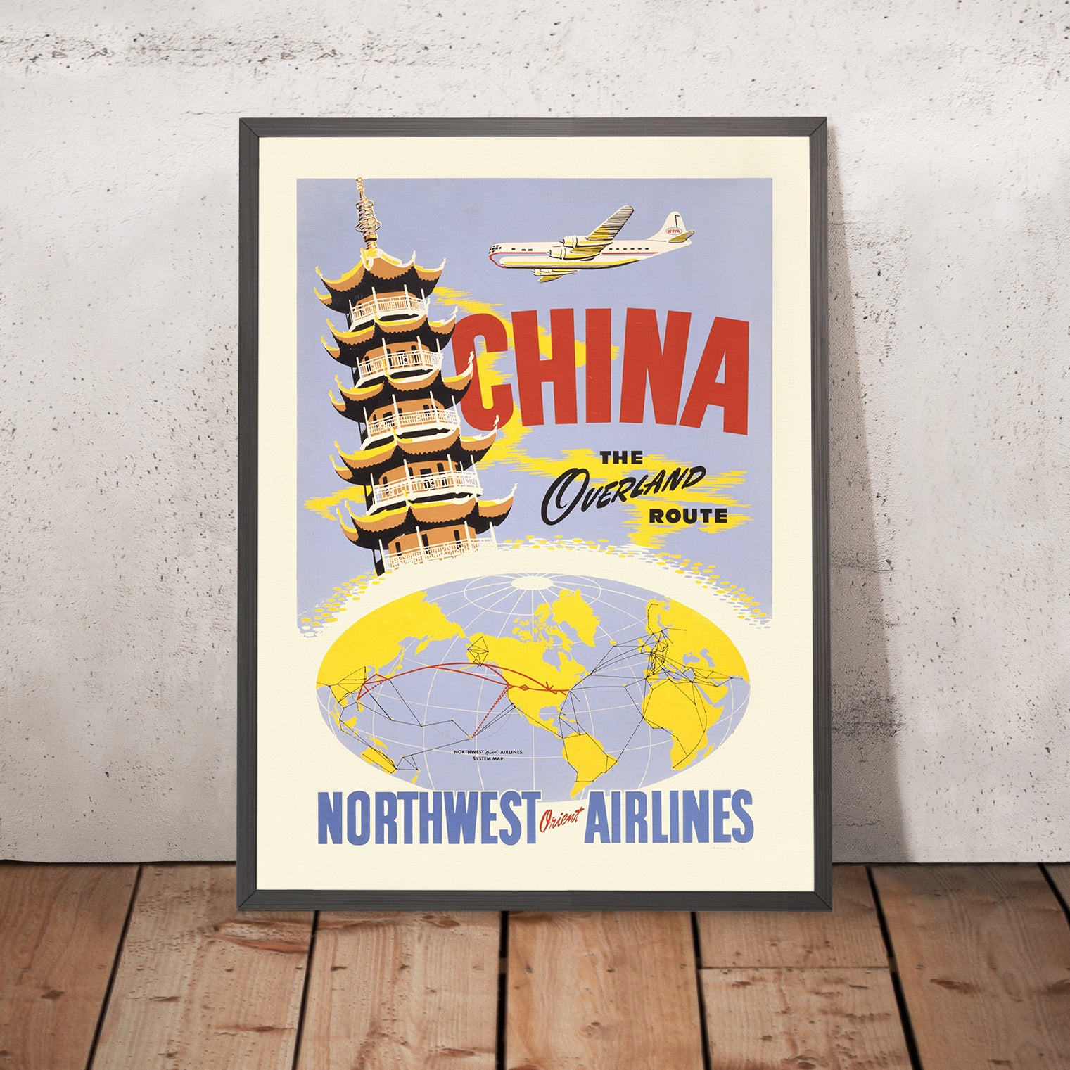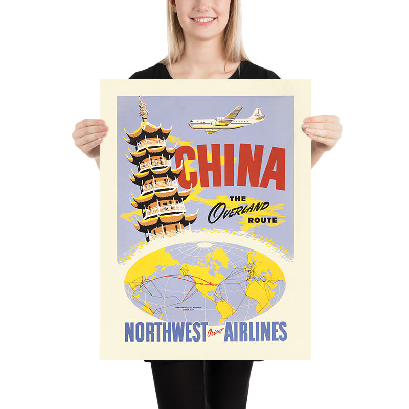 Historical interest: The phrase “the overland route” referred to Northwest’s Great Circle path across northern latitudes—more land, less open ocean—bringing the Far East tantalizingly closer to North American travelers. In 1950, the idea of flying to China still carried the allure of the Silk Road and merchant caravans, yet it was newly accessible to business and leisure passengers. This poster bridges that duality, evoking both age-old mystique and cutting-edge flight technology in a single, collectible image.