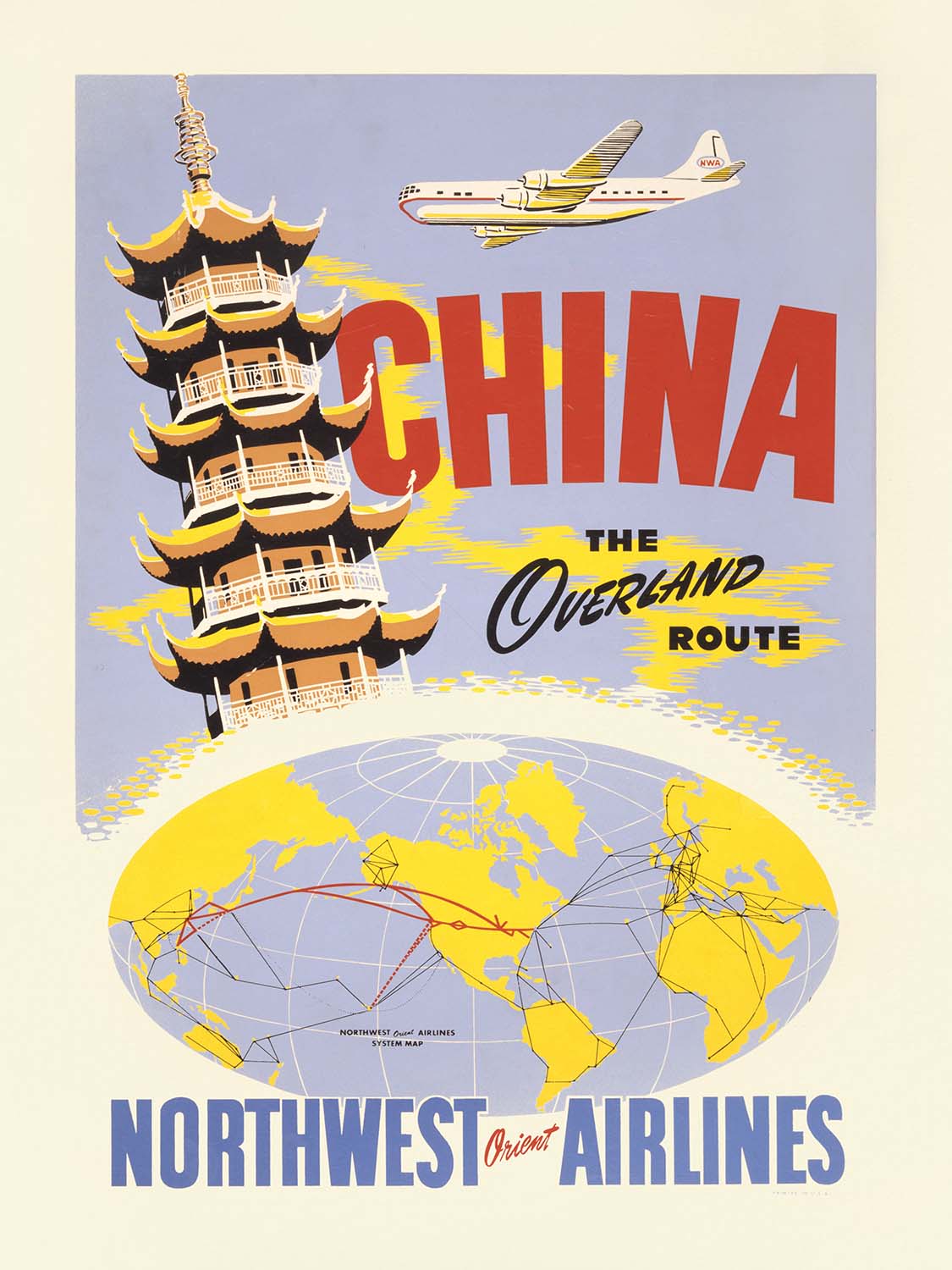 China, the overland route. Northwest Orient Airlines (1950) is a classic mid-century travel poster published by Northwest Orient Airlines, with the individual artist lost to history. Created at the dawn of the postwar boom in trans-Pacific travel, it captures the romance of reaching China via the carrier’s celebrated “overland” Great Circle route—an innovation that shortened flying times by curving over Alaska and the Aleutians to Asia. The composition is distinctly 1950s: a velvety purple field dominates, while lantern-yellow and cinnabar-red accents form a bold central motif that draws the eye from top to bottom.