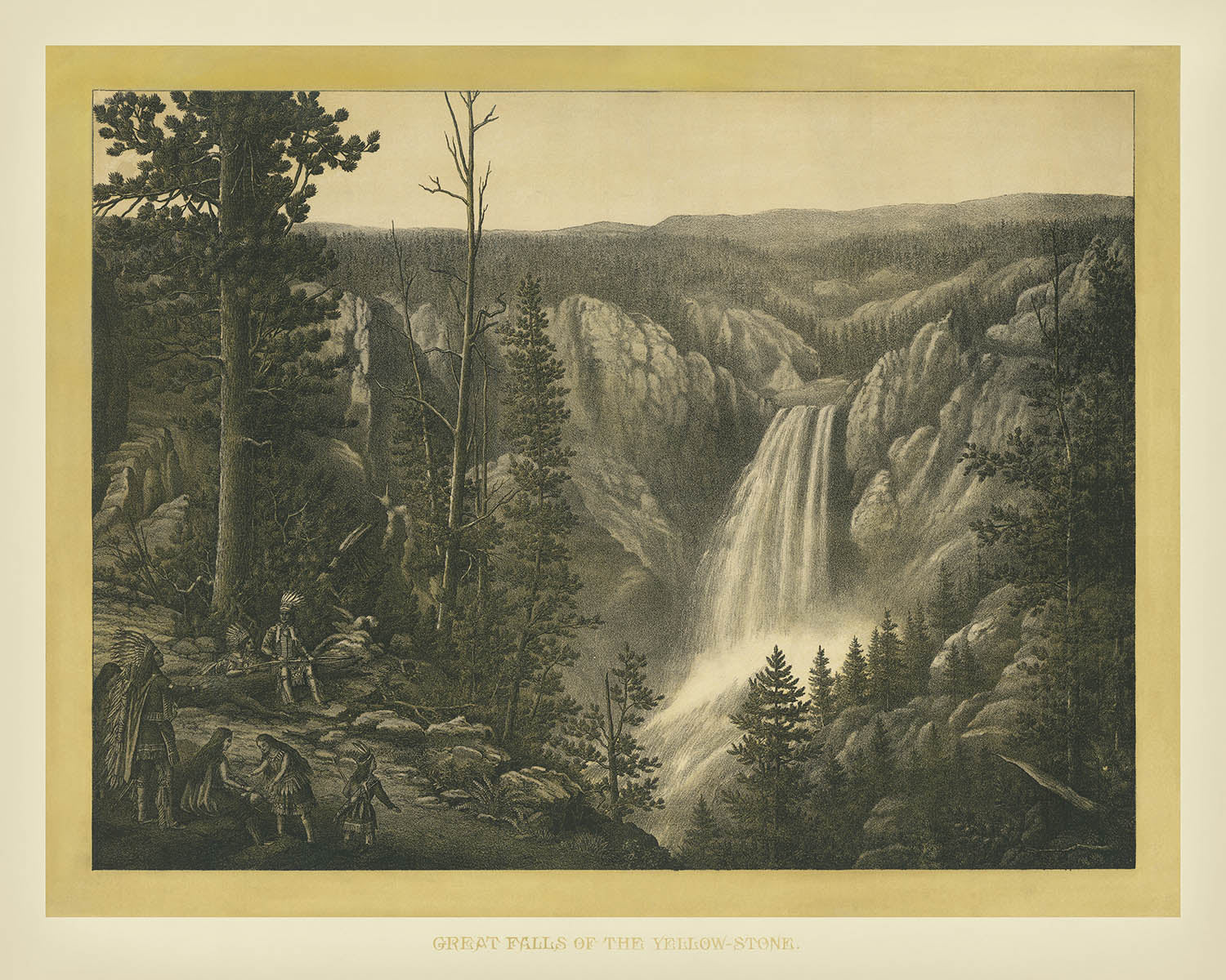 Diese besondere Lithografie wird für ihre Seltenheit und außergewöhnliche Komposition gefeiert. Der weite Blick über die majestätischen Großen Fälle von Yellowstone ist nicht nur visuell beeindruckend, sondern auch historisch bedeutend und fasst die atemberaubende Größe des ersten Nationalparks Amerikas zusammen. Die Anwesenheit der Ureinwohner im Vordergrund verleiht der Szene narrative Tiefe und erinnert die Betrachter an die tiefgreifende Verbindung zwischen dem Land und seinen ursprünglichen Bewohnern.
