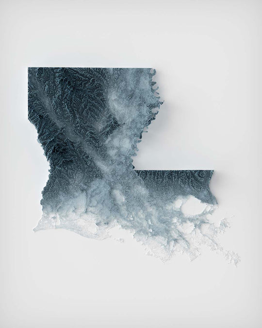 Tauchen Sie ein in die fesselnde Landschaft von Louisiana, Vereinigte Staaten von Amerika – eine Region, in der Wasserwege, Feuchtgebiete und sanfte Erhebungen zu einer der markantesten Topografien Nordamerikas verschmelzen. Diese sorgfältig gestaltete Reliefkarte erweckt Louisianas einzigartige Geografie zum Leben, indem sie zarte Kontraste von Licht und Schatten nutzt, um jede subtile Kontur und den geschwungenen Flusslauf zu betonen.