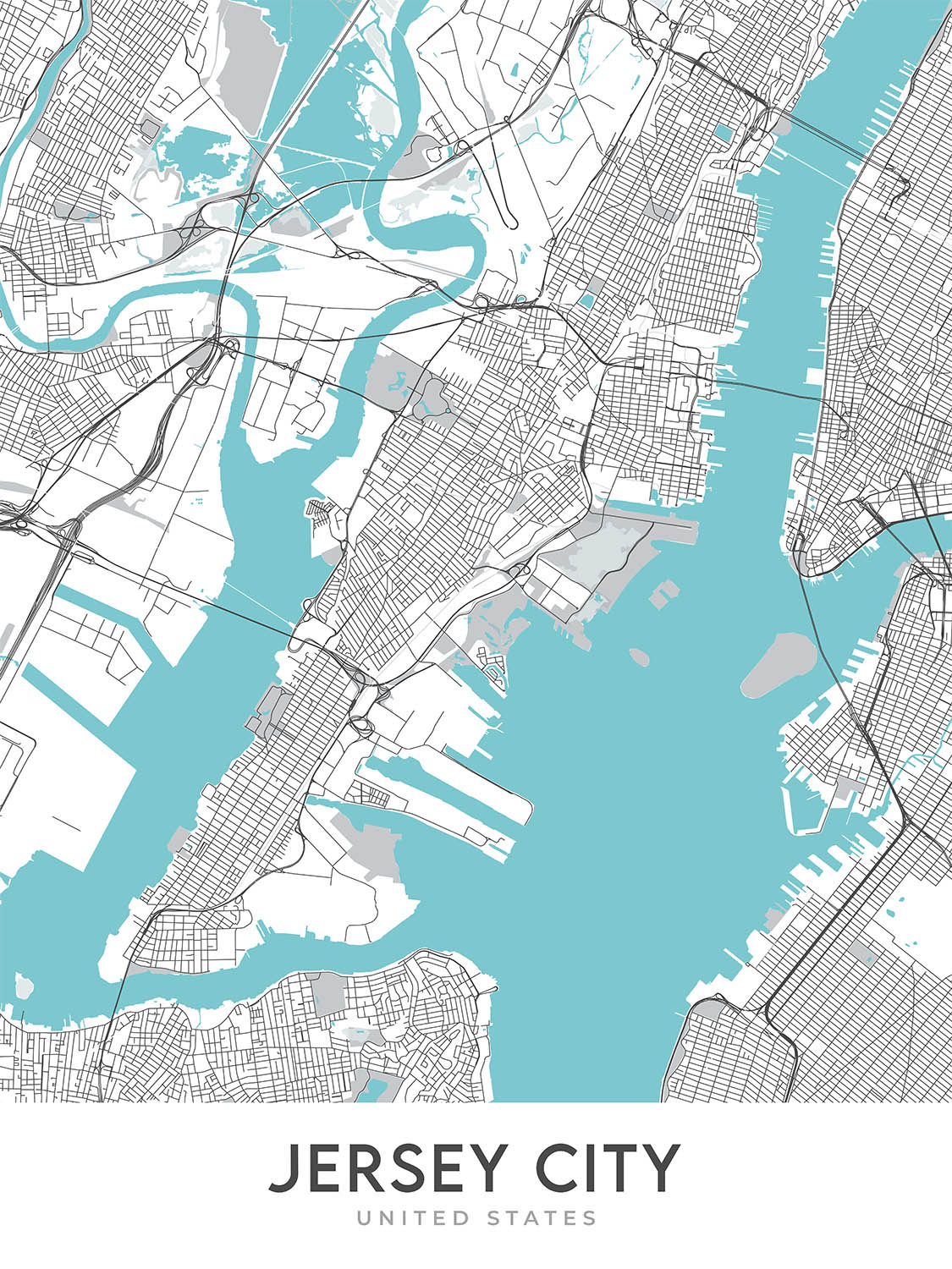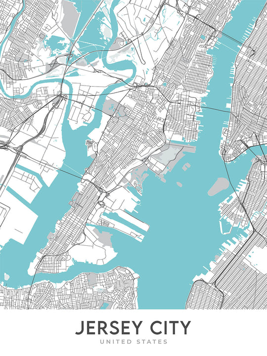 Insgesamt ist diese Karte von Jersey City ein schönes und informatives Kunstwerk, das perfekt für alle ist, die Karten, Design und Jersey City lieben. Es ist ein toller Gesprächseinstieg und eine stilvolle Ergänzung für jedes Zuhause oder Büro.