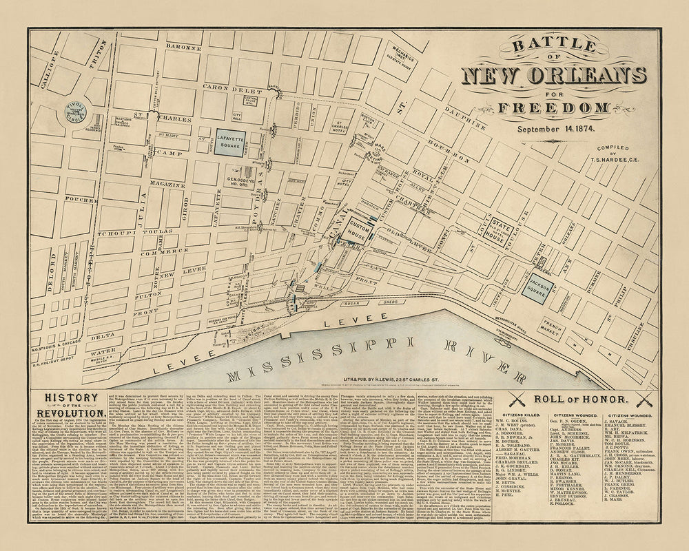Die "Schlacht von New Orleans für die Freiheit, 14. September 1874" ist ein fesselndes historisches Artefakt, das sorgfältig vom angesehenen Stadtvermessungsingenieur Thomas Sydenham Hardee erstellt wurde. Diese Karte bietet eine komplexe Darstellung der berüchtigten Schlacht von New Orleans, einem entscheidenden, aber tragischen Kapitel in der Zeit der Reconstruction nach dem Bürgerkrieg. Hardees detaillierte Kartografie veranschaulicht lebhaft die Positionen und Bewegungen der Kämpfenden und bietet einen seltenen und wertvollen Einblick in die turbulenten Ereignisse, die sich im Herzen von New Orleans entfaltet haben.