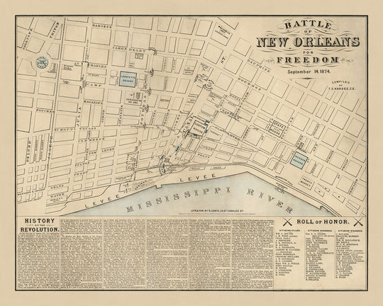 Die historische Bedeutung dieser Karte geht über ihre detaillierte Kartografie hinaus. Sie dient als eindringliche Erinnerung an die umfassenderen politischen und sozialen Kämpfe der Rekonstruktionsära. Die Abschnitte "Ehrenrolle" und "Geschichte der Revolution" bieten eine Erzählung von Tapferkeit und Opferbereitschaft und beleuchten gleichzeitig die umstrittenen und oft gewaltsamen Bemühungen, die Zukunft von Louisiana zu gestalten. Diese Karte ist nicht nur eine Darstellung einer Stadt; sie ist ein Zeugnis für einen kritischen Moment in der amerikanischen Geschichte, festgehalten durch das fachkundige Auge von Thomas Sydenham Hardee.