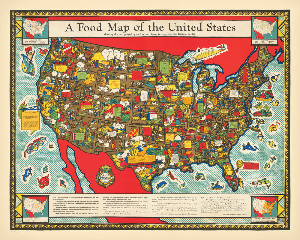 Die Karte ist ein visuelles Fest, das eine Fülle landwirtschaftlicher Produkte aus den 48 Bundesstaaten darstellt. Von den Weizenfeldern des Mittleren Westens bis zu den Zitrusplantagen Floridas wird jede Region mit ihren charakteristischen Erzeugnissen repräsentiert. Die Karte enthält auch charmante Illustrationen von Meereslebewesen in den umliegenden Ozeanen, die dem informativen Layout einen verspielten Touch verleihen. Ein Eskimo auf einem Fisch symbolisiert Alaskas Beitrag zu den großartigen Fischfängen und hebt die Aufmerksamkeit der Karte auf regionale Spezialitäten hervor.