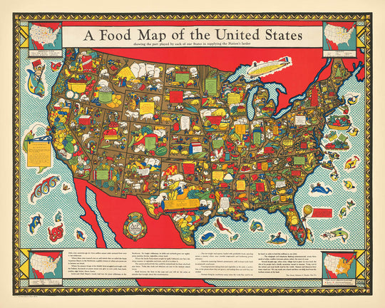 Louis Delton Fancher, bekannt für seine grafische Kunst, bringt sein Fachwissen in dieses entzückende Werk ein. Bekannt für seine Arbeit mit der Great Atlantic & Pacific Tea Company (A & P), entwarf Fancher diese Karte als Werbematerial für die Weltausstellung. Sein einzigartiger Stil kombiniert informative Inhalte mit ansprechenden visuellen Elementen, wodurch die Karte sowohl ein Bildungswerkzeug als auch ein Kunstwerk ist. Fanchers Fähigkeit, Ästhetik mit Funktionalität zu verbinden, zeigt sich in jedem Detail, von den filigranen Staatsgrenzen bis zu den verspielten Illustrationen von Nahrungsmitteln.