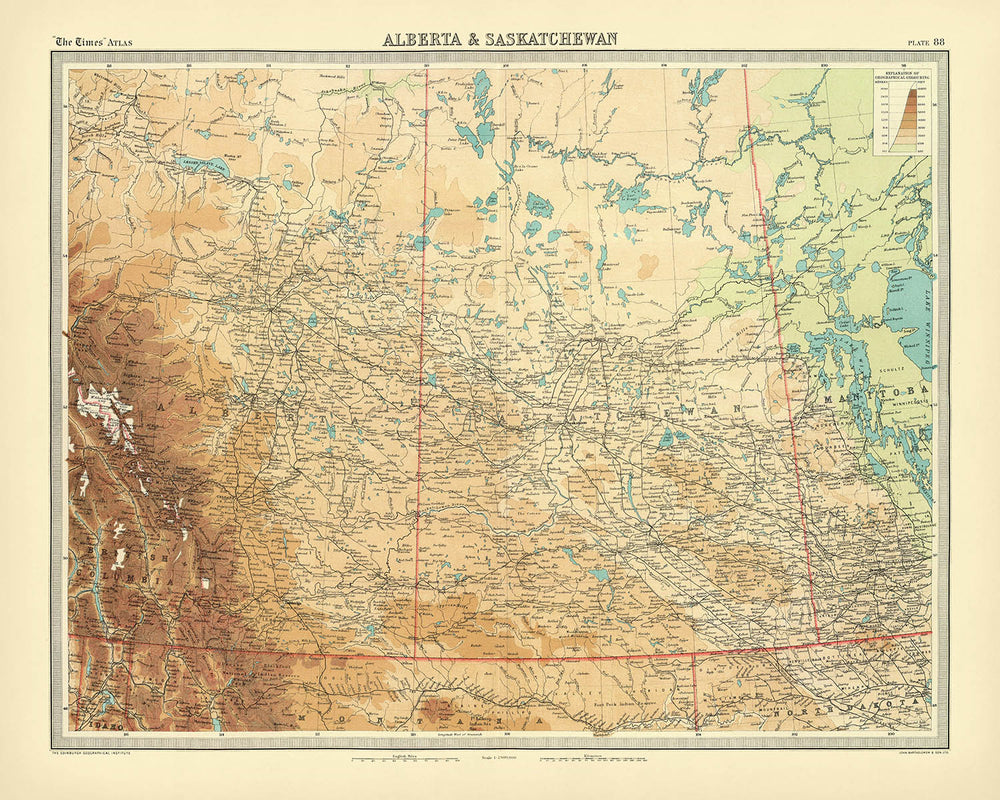 Die Karte, die Korrekturen aus der Ausgabe von 1920 einbezieht, gewährleistet Zuverlässigkeit und Genauigkeit, ein Markenzeichen von Bartholomews kartografischem Erbe. Sie steht als Zeugnis für die Entwicklung der Atlasveröffentlichung und beeinflusst geografische Referenzen bis in die Gegenwart. Die "Alberta & Saskatchewan"-Karte ist mehr als nur ein Navigationshilfsmittel; sie ist ein Stück Geschichte, eine luxuriöse Ergänzung jeder Sammlung und eine Feier der Kunst und Wissenschaft der Kartenherstellung.