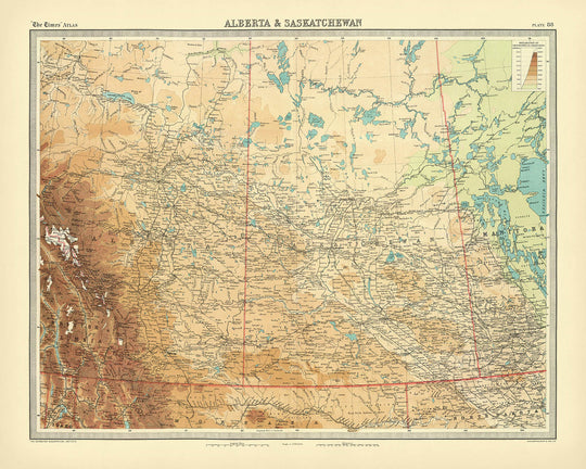 Über ihre geografischen Details hinaus ist die Karte reich an historischer Bedeutung. Sie kartiert nicht nur die physische Landschaft, sondern erfasst auch das kulturelle und politische Milieu der Zeit. Die Grenzen zwischen Alberta, Saskatchewan und Manitoba sind klar definiert und spiegeln die politischen Grenzen der Ära wider. Diese Karte ist ein sammelwürdiger Schatz für Liebhaber der historischen Kartografie und bietet mit jeder Kontur und Linie einen Einblick in die Vergangenheit.