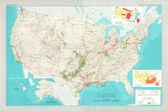 Betreten Sie die Welt von 1966 mit der Karte "Rohöl- und Produktpipelines", einem fesselnden Stück, das vom United States Geological Survey erstellt wurde. Diese Karte bietet eine lebendige Darstellung der Öl-Infrastruktur der Vereinigten Staaten während einer entscheidenden Ära und hebt das komplexe Netzwerk von Pipelines und Raffinerien hervor, das die Nation antrieb. Als Teil der "Sonderkarten" im National Atlas der Vereinigten Staaten von Amerika diente diese Karte nicht nur als praktisches Werkzeug für Entscheidungsträger und Forscher, sondern auch als Zeugnis für die wirtschaftliche und industrielle Stärke des Landes.