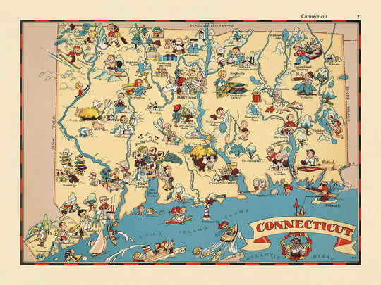Bildkarte von Connecticut von Ruth Taylor White, 1935: Bridgeport, New Haven, Yale, Long Island Sound, Connecticut River
