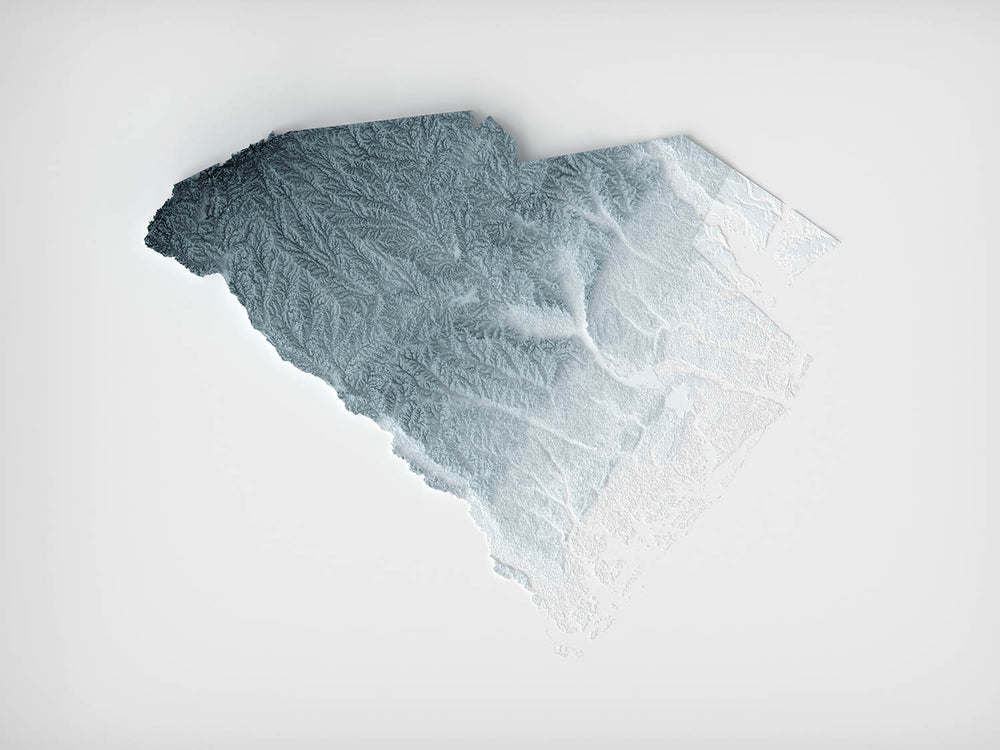 Bringen Sie den Geist von South Carolina in Ihr Zuhause mit dieser exquisit detaillierten Reliefkarte, die das Wesen des Palmetto-Staats durch seine auffälligen Landformen und geschichtsträchtigen Landschaften einfängt. Diese Karte erweckt den gesamten Staat zum Leben – von den sanften Hügeln des Upcountry bis zur sonnenverwöhnten Küste des Atlantiks – und nutzt Licht und Schatten, um jede subtile Erhebung und Senke zu betonen.