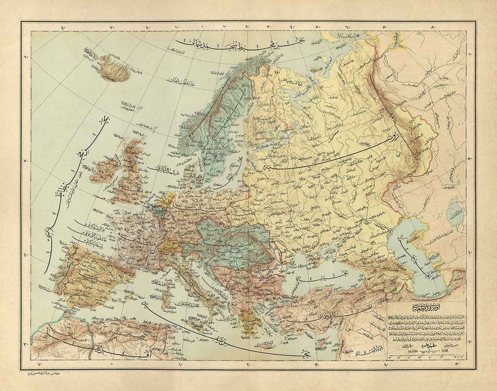 Alte arabische Karte von Europa von Hafız Ali Eşref, 1893: UK, Frankreich, Deutschland, Spanien, Osmanisches Reich, Türkei, Russland