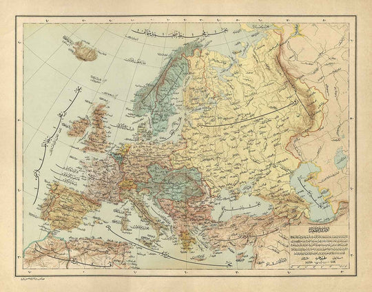 Dies ist eine alte und äußerst seltene Karte von Europa, die ursprünglich 1893 veröffentlicht wurde. Ungewöhnlicherweise wurde diese Karte von dem ersten modernen türkischen Kartografen Hafız Ali Eşref (auch bekannt als Ali Sheref Pasha) erstellt und ist in osmanisch-türkischer arabischer Schrift beschriftet.