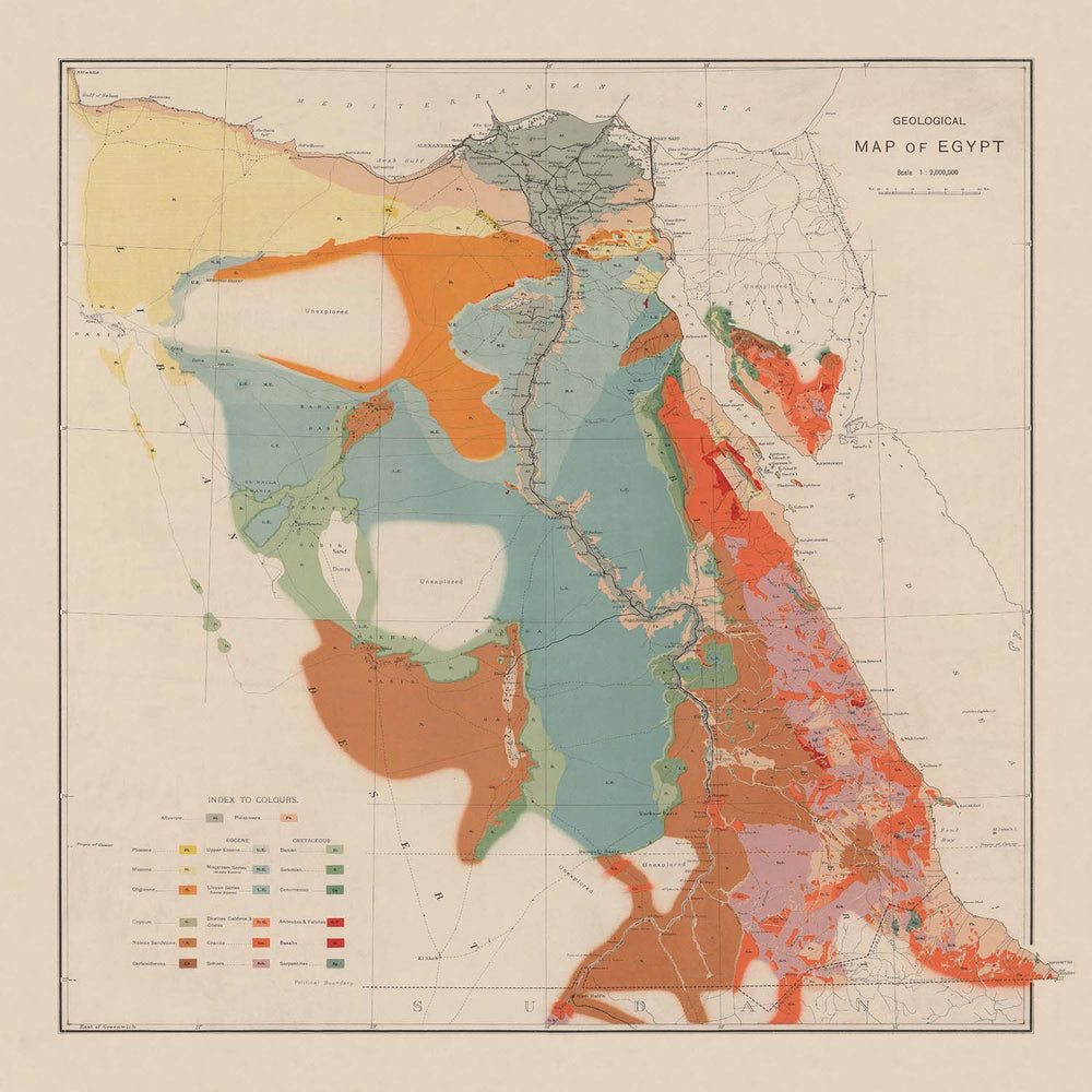 Die detaillierte Darstellung der Grenzen auf der Karte, einschließlich der Abgrenzung zwischen Ägypten und Sudan, bietet einen Einblick in die geopolitische Landschaft der damaligen Zeit. Während die Karte sich auf geologische Formationen konzentriert, deutet sie subtil auf die historischen und politischen Erzählungen hin, die die Region geprägt haben. Dieser Kontext bereichert den Wert der Karte und bietet ein vielschichtiges Verständnis der Kräfte, die Ägyptens Entwicklung als Nation beeinflusst haben.