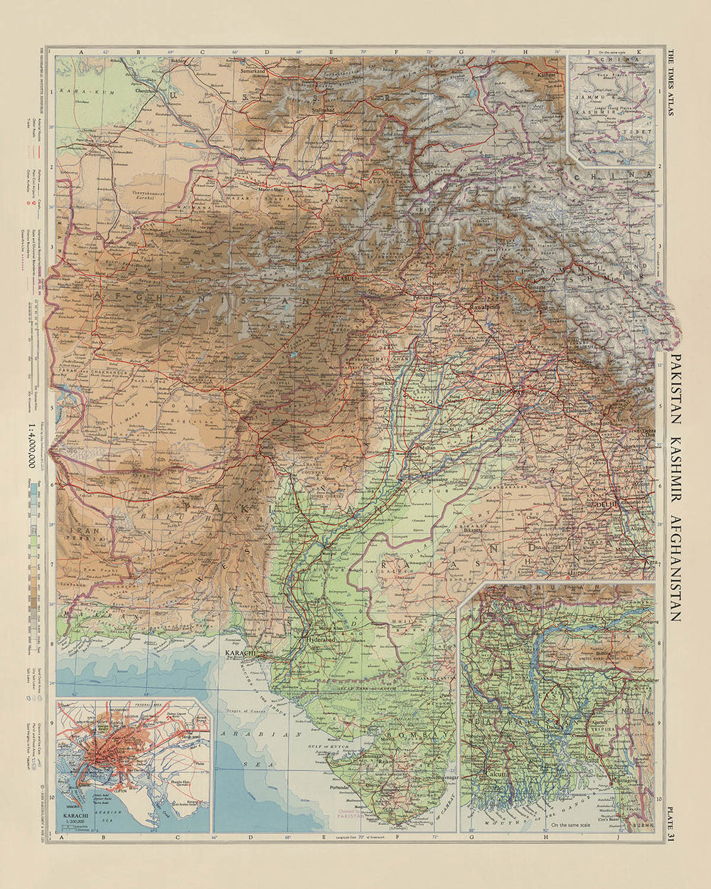 Alte Karte von Kaschmir, Pakistan und Afghanistan von Bartholomew, 1959: Karachi, Indus, Hindu Kush, Kabul, Lahore