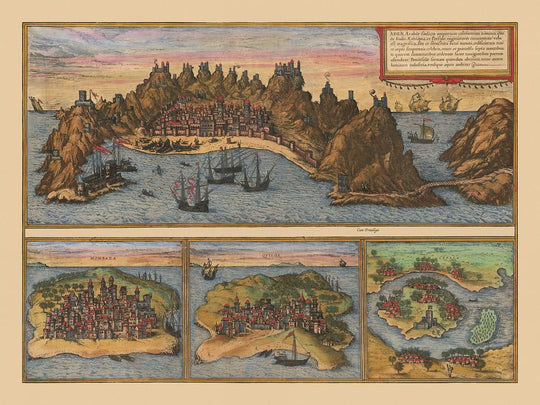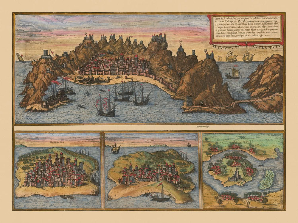 Alter bildlicher Stadtplan von Aden von Braun & Hogenberg, 1572: Mombasa, Kilwa, Sofala, Befestigungen, Häfen, Schiffe