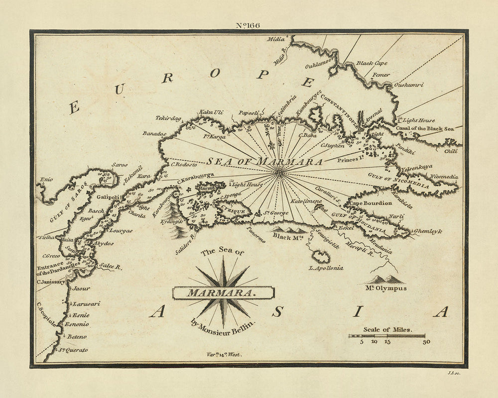 Diese Karte ist eine wahre Fundgrube an geografischen Informationen und zeigt nicht nur das Marmarameer, sondern auch die umliegenden Regionen. Wichtige Städte wie Istanbul, Bursa und Edirne sind sorgfältig markiert und spielen eine zentrale Rolle für das Verständnis der wirtschaftlichen und kulturellen Landschaft der Region in dieser Zeit. Die Einbeziehung kleinerer, aber bedeutender Orte wie der Halbinsel Gallipoli und der Inseln Imbros und Tenedos bietet einen umfassenden Überblick über die strategischen Punkte entlang dieser wichtigen Wasserstraßen. Die Darstellung der Dardanellen und des Bosporus als Verbindungswege zwischen den Meeren unterstreicht ihre immense Bedeutung für historische Seerouten.