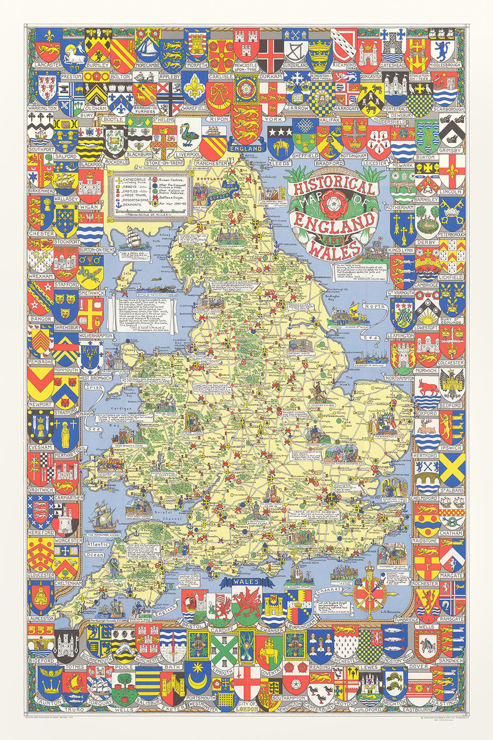 Alte historische Karte von England und Wales von Bullock, 1958: Schlachten, Ereignisse, berühmte Personen, Stadtwappen