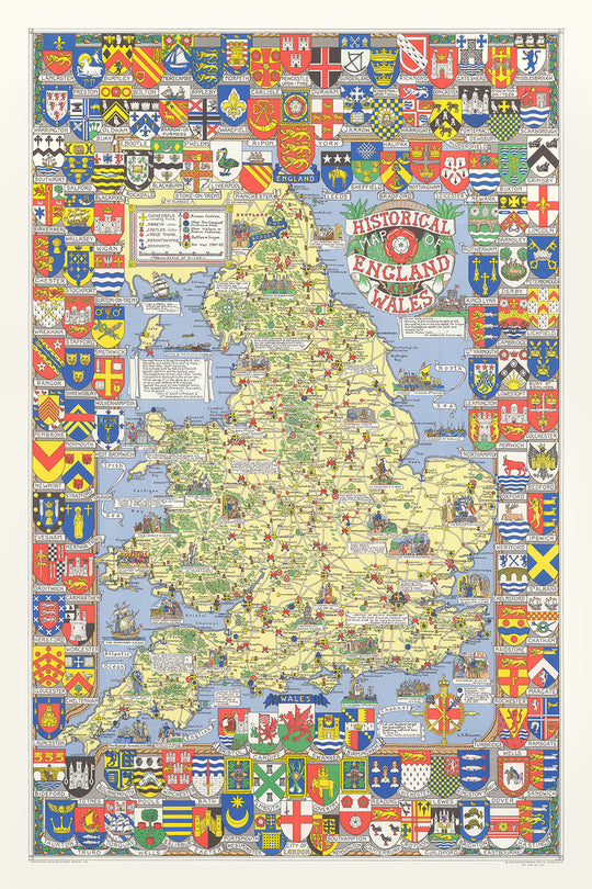 Bullocks Schöpfung ist mehr als nur eine Karte; sie ist ein historisches Dokument, das das Wesen von England und Wales einfängt. Die über die Karte verstreuten Anmerkungen heben berühmte Schlachten hervor, wie die, an denen Boadicea beteiligt war, und bedeutende Ereignisse wie das Domesday Book. Diese historischen Notizen bieten Kontext und Tiefe und verwandeln die Karte in eine Erzählung der Vergangenheit. Die Einbeziehung von Wappen am Rand der Karte bereichert ihren historischen Wert weiter und bietet einen Einblick in die heraldischen Traditionen verschiedener Städte.