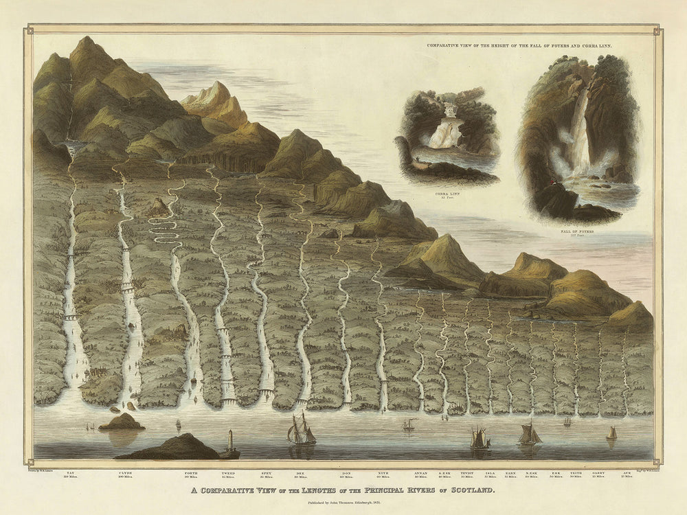 Alte Infografik der Flüsse und Wasserfälle Schottlands von Lizars, 1832: Vergleichstabelle der Längen und Höhen