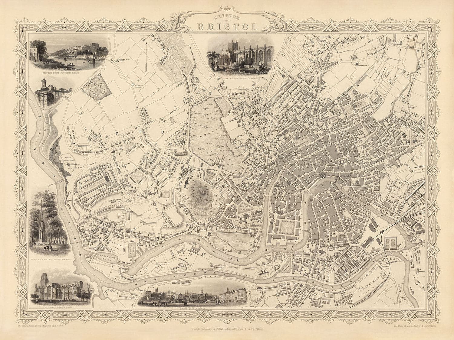 Um die Ränder der Karte sind detaillierte Gravuren von bedeutenden Gebäuden und Wahrzeichen in Bristol und Clifton zu sehen, darunter die Kathedrale von Bristol, eine schöne Aussicht auf Clifton von der Rownham Fähre, College Green, die Redcliff Kirche und der Broad Quay.