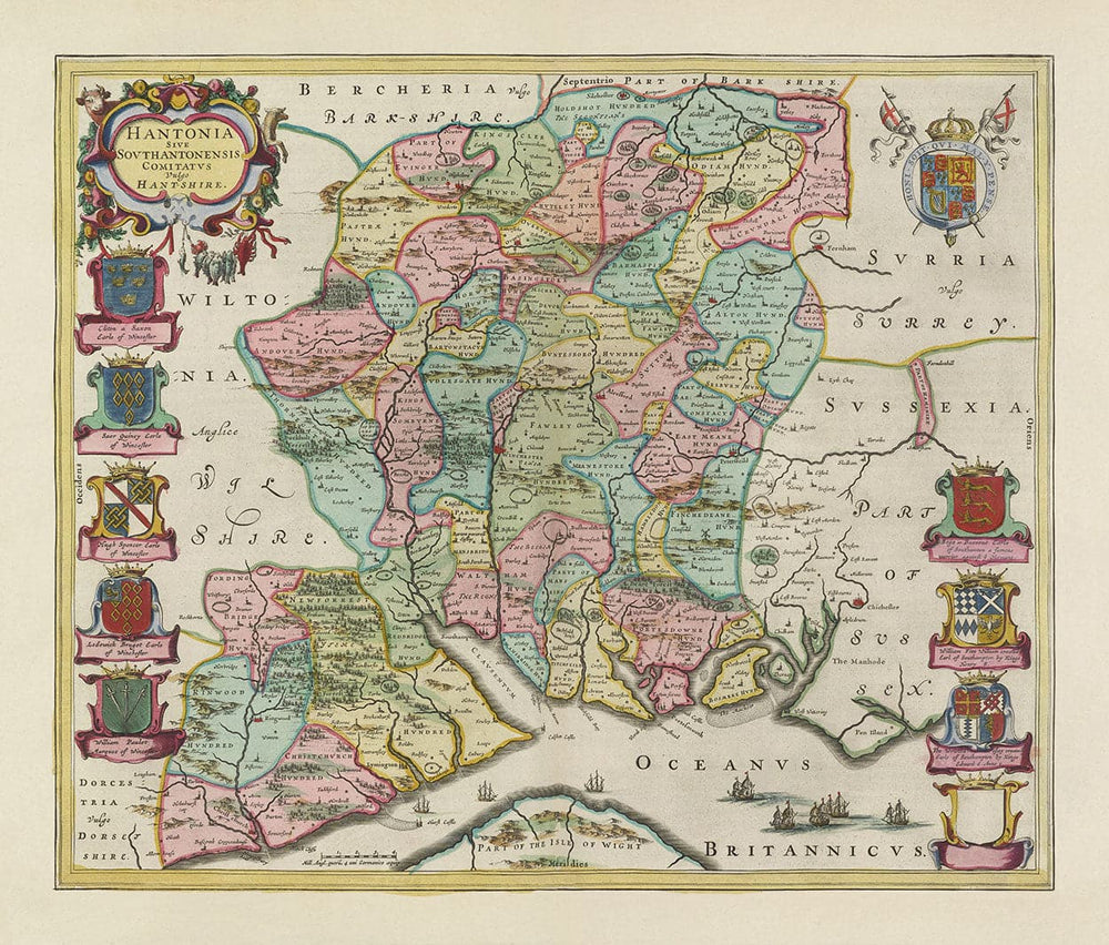 Alte Karte von Hampshire, 1665 von Joan Blaeu: Winchester, Portsmouth, Southampton, Basingstoke, Farnborough, Havant