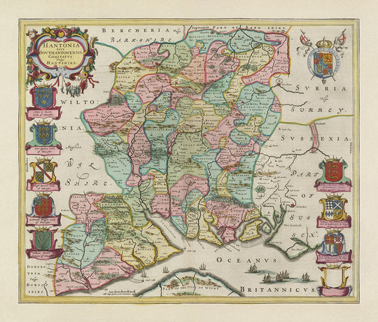 Dies ist eine äußerst seltene, alte farbige Karte von Hampshire, die von dem Meisterkartenmacher Joan Blaeu in seiner Werkstatt in Amsterdam erstellt und ursprünglich 1665 in diesem Theatrum Orbis Terrarum Sive Atlas Novus veröffentlicht wurde.