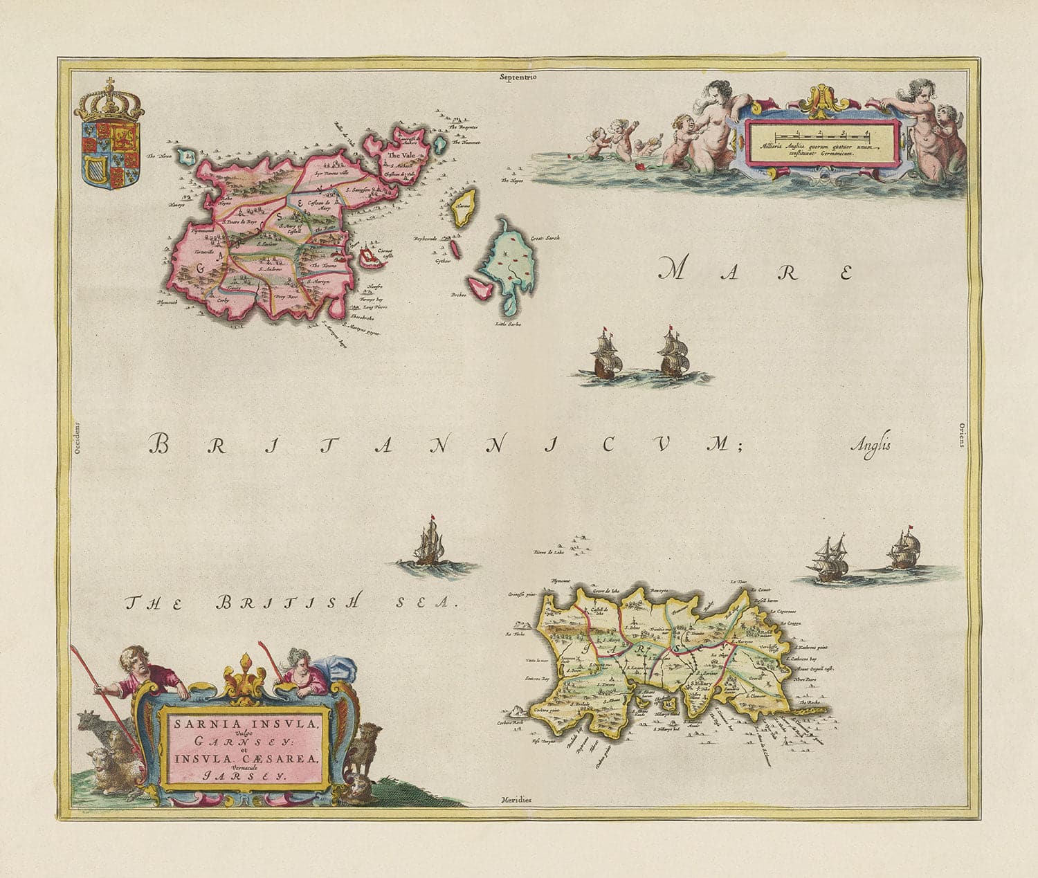 Alte Karte von Jersey und Guernsey, 1665 von Blaeu: Englische Kanalinseln, Bailiwicks und Kronbesitzungen, St. Helier, Saint Peter Port